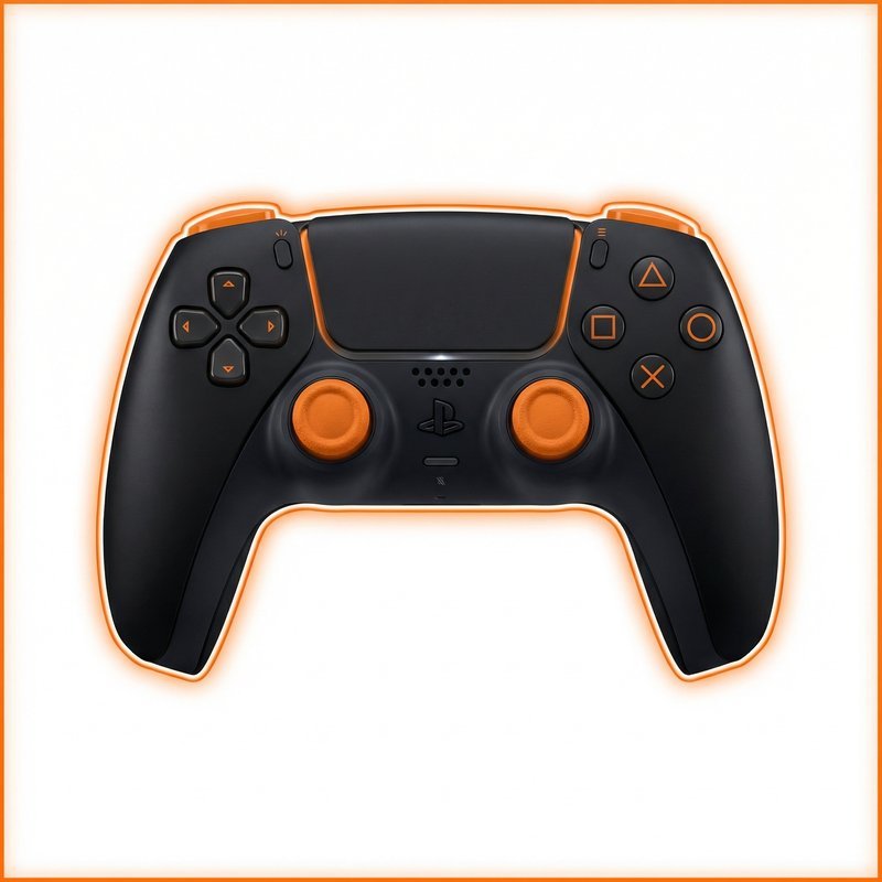 يد تحكم PlayStation 5 بتصميم حصري أسود وبرتقالي. تتميز بتقنية Haptic Feedback وزنادات تكيفية لتجربة لعب غامرة.